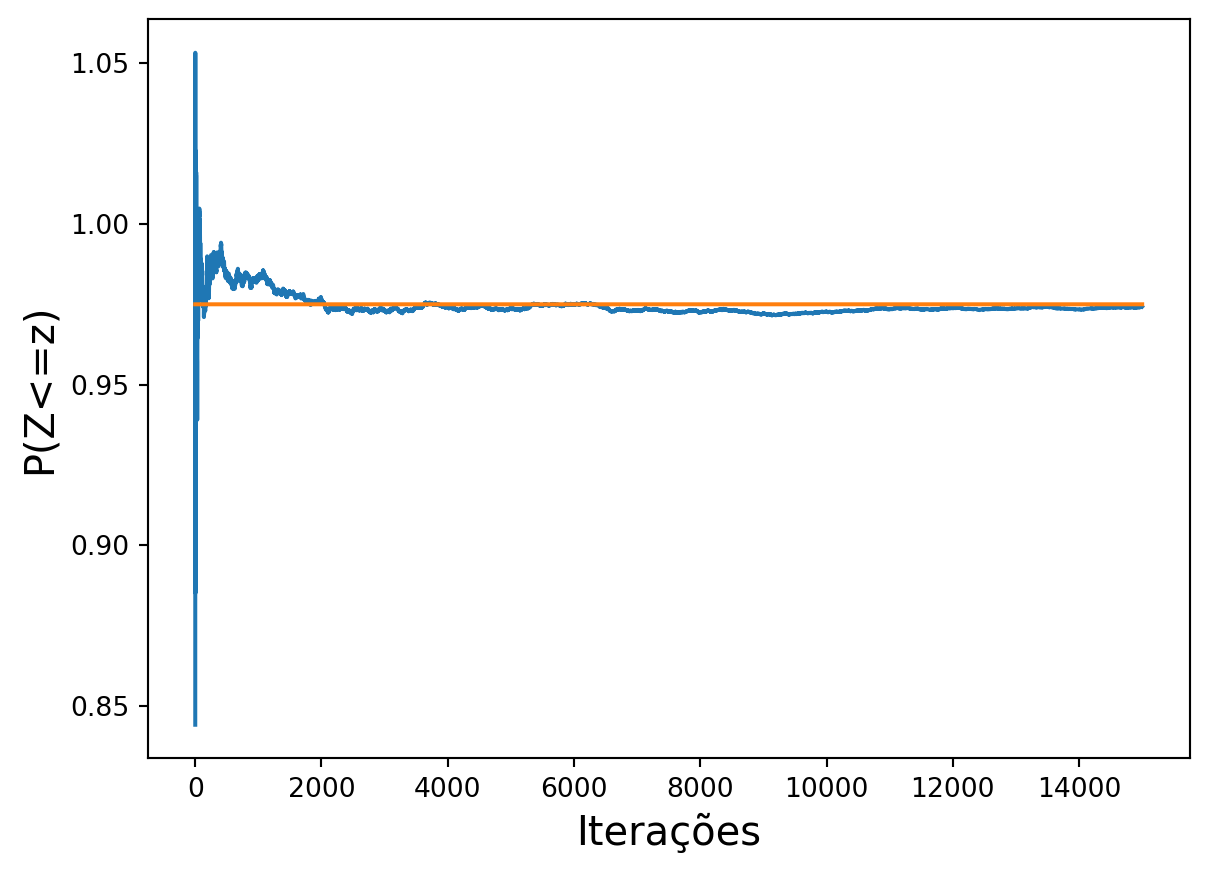# função auxiliar para retornar o valor da# função densidade normal padrãodef phi(z):return (1/ (2* math.pi)**0.5* np.exp(-z * z /2))# Método de Newton-Raphson para obtermos quantis # da distribuição normal com média real mu e desvio # padrão real positivo sig, dado 0 < p < 1# utiliza as funções phi(z) e phnorm(z), # apresentadas anteriormentedef qphi(p, mu =0, sig =1, func = phnorm): eps =1e-11if p <=0or p >=1:print('Valor de p deve estar entre 0 e 1!')returnif sig <=0:print('Desvio padrão deve ser maior que 0!') returnifabs(p -0.5) <= eps: z1 =0else:if p <0.5: z0 =-0.1else: z0 =0.1 it =1 itmax =2000 convergiu =Falsewhile convergiu ==False: z1 = z0 - (func(z0) - p) / phi(z0)ifabs(z0 - z1) <= eps *abs(z0) or it > itmax: convergiu =True it = it +1 z0 = z1return {'x': z1 * sig + mu, 'iter': it -1} # Exemplop =0.975mu =0sig =1qphi(p, mu, sig, phnorm)sps.norm.ppf(p, mu, sig) #para fins de comparação