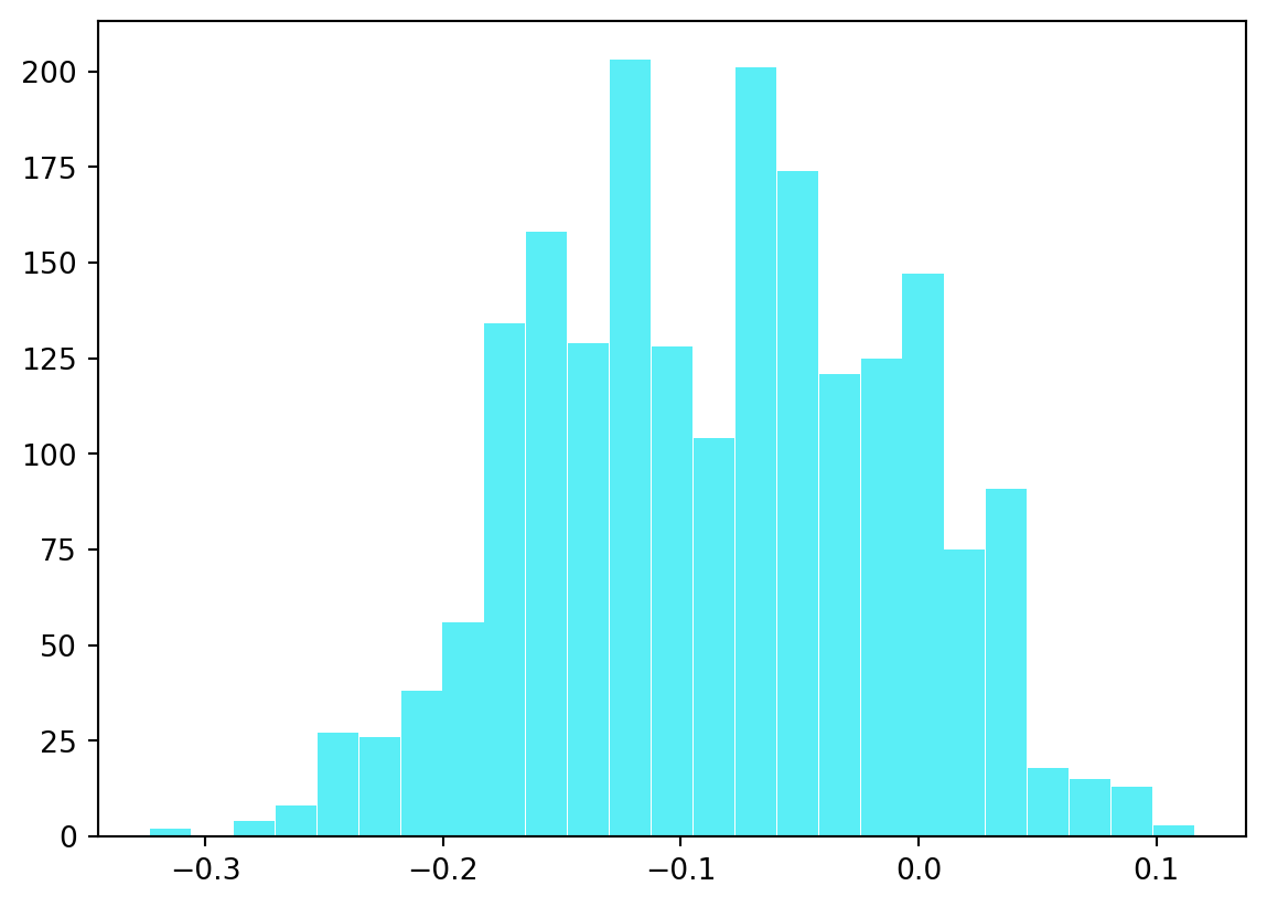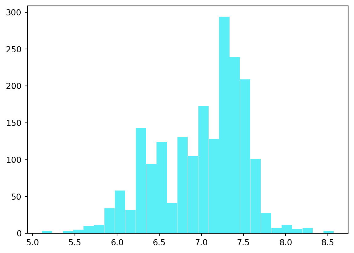 # função para obter o erro padrão do estimador# e aplicar a correção de viésdef stderr_vies_est(x, est, B =2000, *args): result = dist_boot(x, est, B, *args) se_boot = np.std(result) est_boot = est(x, *args) mean_boot = np.mean(result) vies_boot = mean_boot - est_boot est_nvies = est_boot - vies_bootreturn {"Estimativa": est_boot, "Erro padrão": se_boot, \"Viés ": vies_boot, "Est. Não Viesada ": est_nvies}# estimar mediana exponencial e erro padrãoimport scipy as spn =300B =2000lamb =0.1x = np.random.exponential(scale =1/ lamb, size = n) dist = dist_boot(x, est_med)plt.clf() # limpar o gráficograf=plt.hist(dist, bins='auto',color='#14e8f3',rwidth=0.98,alpha=0.7) # histograma res_med = stderr_vies_est(x, est_med, B)for key, value in res_med.items():print(f"{key}: {value}")# mediana teóricasp.stats.expon.ppf(0.5, scale =1/ lamb)